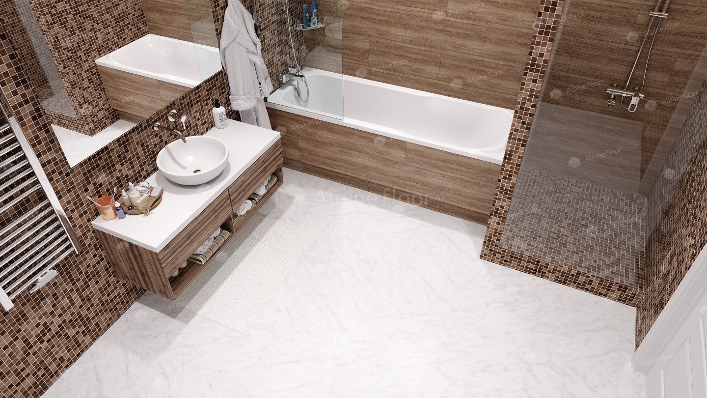 Думаете, что вода может испортить эту картину? Нет. Водостойкое покрытие лишено недостатков дерева и ламината. Это идеальный выбор для ванных комнат.